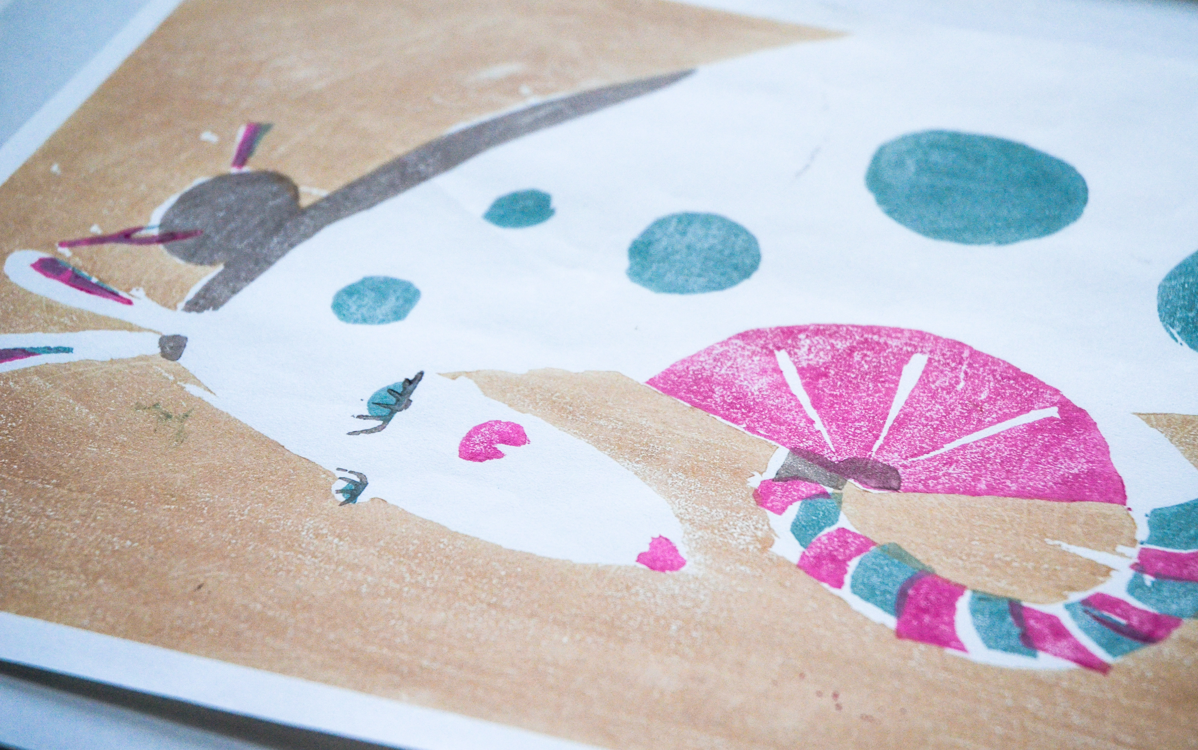 Japanese Watercolour Woodcut Original prints made in a traditional Japanese way of printing. I got to participate this special printing course when I was in Helsinki for my exchange semester. During the course I made a four-layered woodcut print, in a limited edition of 20. All prints vary in colours and of course all of them contain individual characteristics (and maybe printing mistakes :) ) My style of working isn't detailed and perfectionist but more intuitive and expressionist. I transport emotions and quirkyness rather than gaining respect for a persistent execution of detail. The traditional creation technique itself almost became a meditative process: mixing own colours with pigment, the right treatment of the paper )proper wetting and cutting), producing and preparing the wooden plates and eventually colouring them for printing.